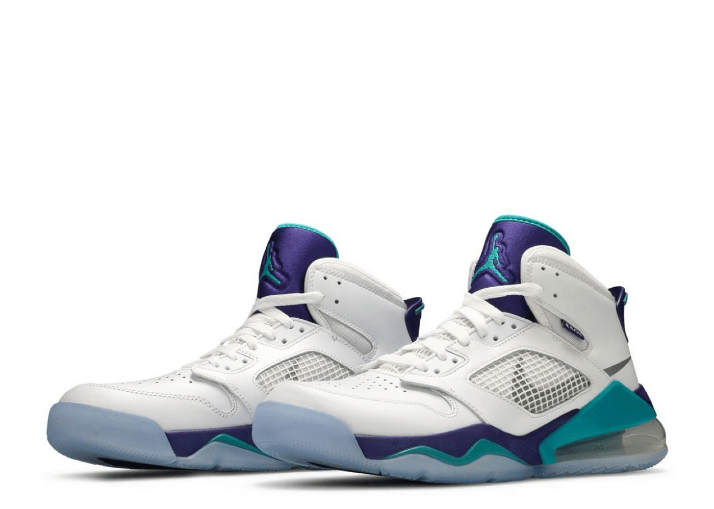 A multifaceted homage to several classic Air Jordans, the Jordan Mars 270 has taken on many a classically-styled colorway during its brief time on the market, and now it’s appeared in a recognizable “Grape” makeup. A palette first made famous on the Air Jordan 5, “Grape” is a true paradigm of ’90s culture, featuring prominently on the feet of one Will Smith in “The Fresh Prince Of Bel-Air” and serving as inspiration for several other releases since its salad days. It’s interpreted in true-to the original fashion here, with a white leather base giving way to vibrant purple and aqua accents on the tongue, Air Jordan 6-style heel tab/midsole, and the heel’s Jumpman branding. A small “Mars” tag graces the lateral collar, and a shimmering silver Swoosh is placed under the midfoot’s Air Jordan 4-esque netting. Cushioning is provided by a recognizable Air Max 270 heel unit, and an icy blue translucent outsole completes the look.